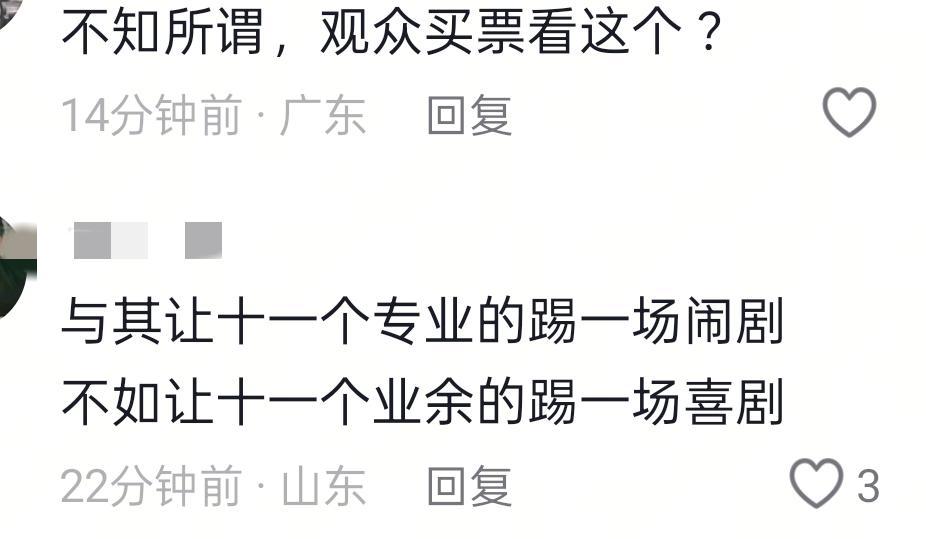 有的网友夸这足球比赛办的好,与其让十一个专业选手踢一场业余赛,不如让十一个业余的踢一场喜剧。
